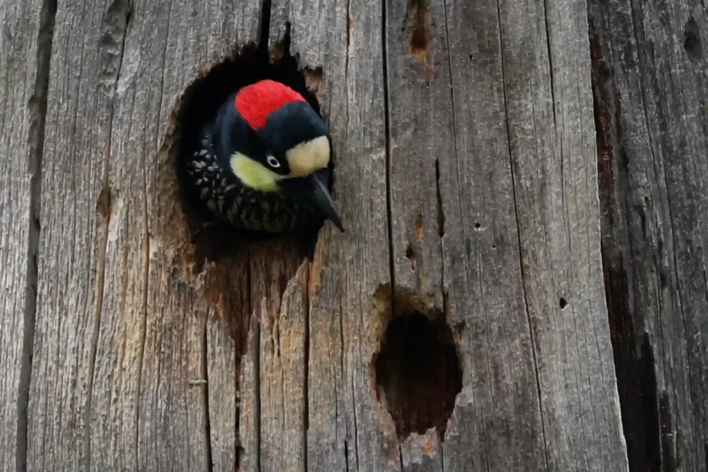 The Acorn Woodpecker is a boldly patterned, medium-sized woodpecker found in oak and mixed woodlands from the western United States through Central America to Colombia, distinguished by its clownish red, white, and black face pattern and remarkable social behavior of living in family groups that collectively store thousands of acorns in specially drilled holes in…