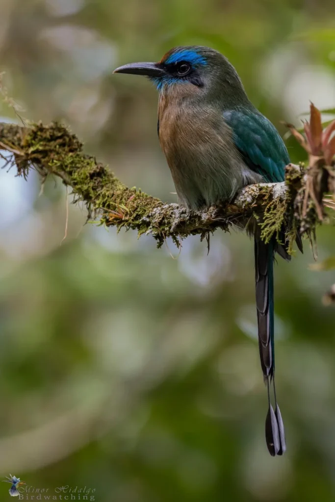 Medium-sized green bird with distinctive broad, flattened bill with raised ridge (keel). Look for rufous forehead, black mask, blue throat, and long tail with racket tips. The broad bill distinguishes it from other motmots.