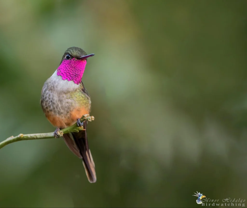 Males are unmistakable with their brilliant magenta-purple gorget, deeply forked tail, and tiny size. Females are trickier, showing buff underparts with green spots, a short tail with cinnamon tips, and a white spot behind the eye. This is one of the smallest hummingbirds you’ll see in Costa Rica’s mountains.