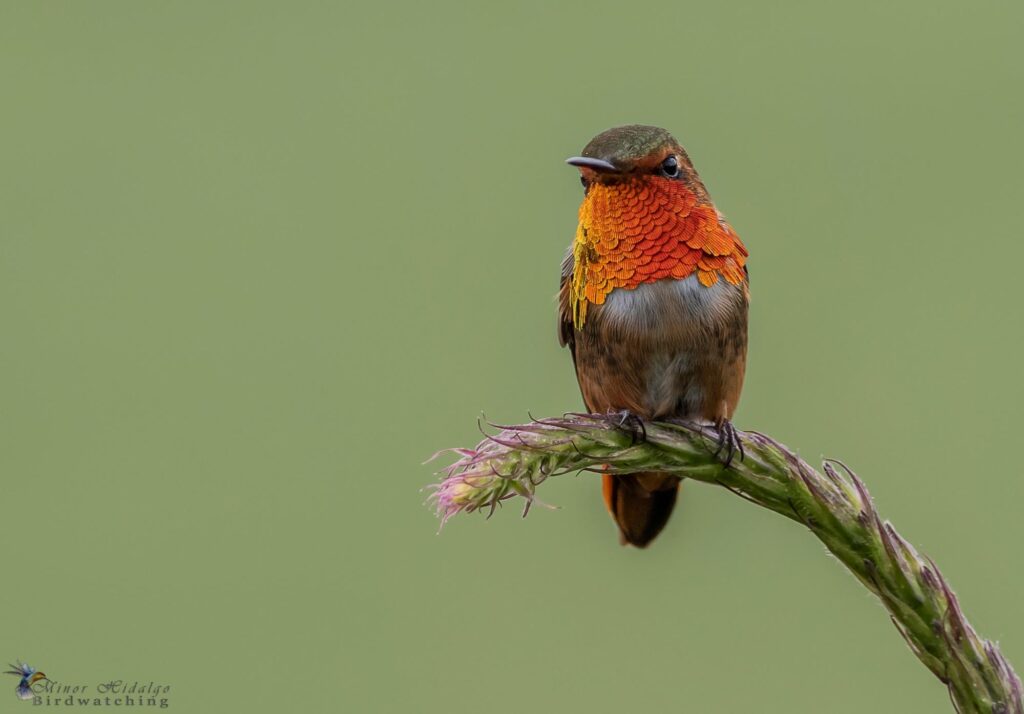 Look for Costa Rica’s tiniest bird – smaller than any other hummingbird. Males show a brilliant orange-red gorget and rufous tail with white tips. Females lack the gorget but share the distinctive rufous and black tail pattern with white tips. The extremely small size alone often confirms identification.