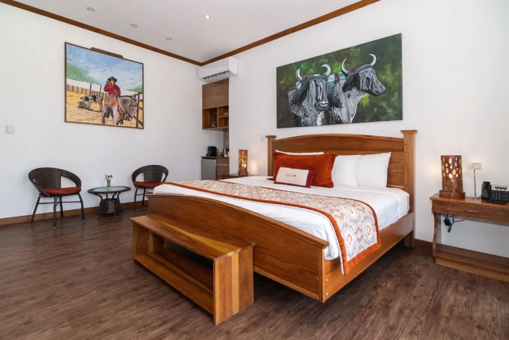 Hacienda Guachipelín offers standard and superior rooms as well as suites, all with private bathrooms, air-conditioning, Wi-Fi, safes, and garden or volcano views. The open-air restaurant serves Costa Rican and international dishes, with special diets accommodated on request.