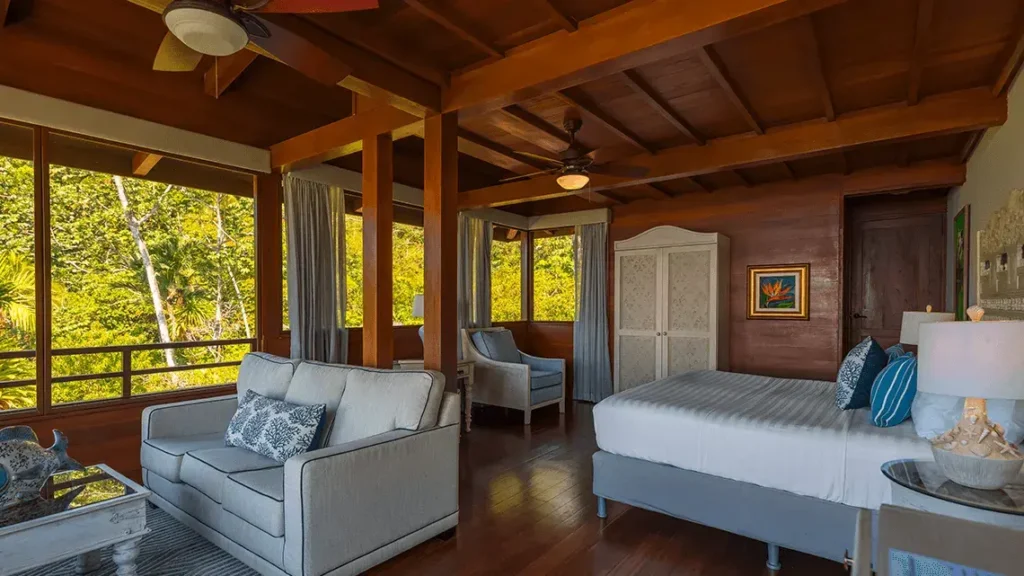Playa Cativo features spacious deluxe, luxury, and premium rooms with ocean views, private bathrooms with hot water, ceiling fans, safes, and organic bath products. Some rooms with private plunge pools. Rates include all meals prepared with ingredients from the lodge’s farm and local producers, with special diets accommodated on request.