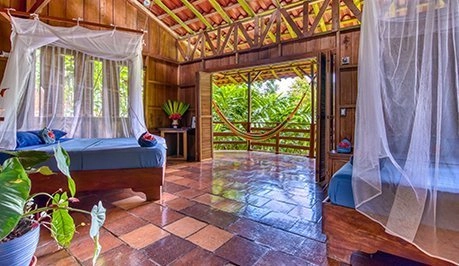 Selva Bananito Lodge offers spacious, elegantly tiled bathrooms with solar heated water, one queen or two queen beds in each room, and cozy hammocks for your afternoon siestas. Selva Bananito is “off the grid” meaning there is no electricity. Water is heated by solar power, and dinners are served by candlelight. There are no generators on site to spoil the serenity and peaceful surroundings. The main lodge provides a comfortable area for meals and socializing as well as ample decks with spectacular views.