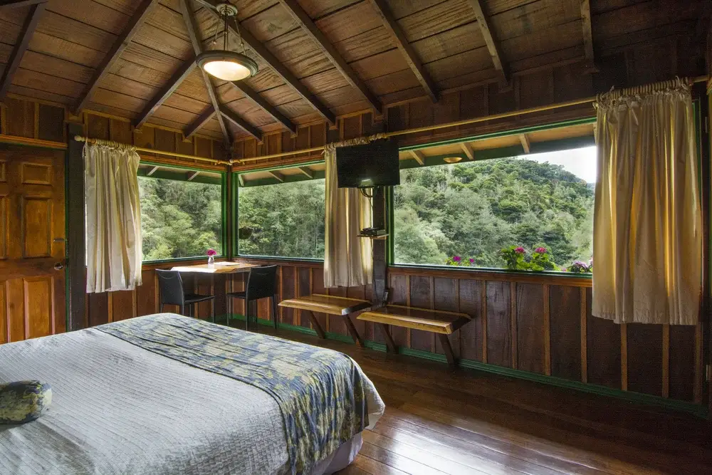 Comfortable cabins and rooms with private bathrooms, hot showers, and mountain or garden views. The cool highland climate makes air conditioning unnecessary. The on-site restaurant serves Costa Rican and international dishes, with vegetarian and other dietary needs accommodated.